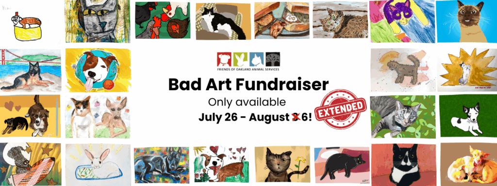 Support life-saving programs that benefit Oakland’s shelter animals, brighten someone’s day, and get a piece of art you’ll never forget (no matter how hard you try).