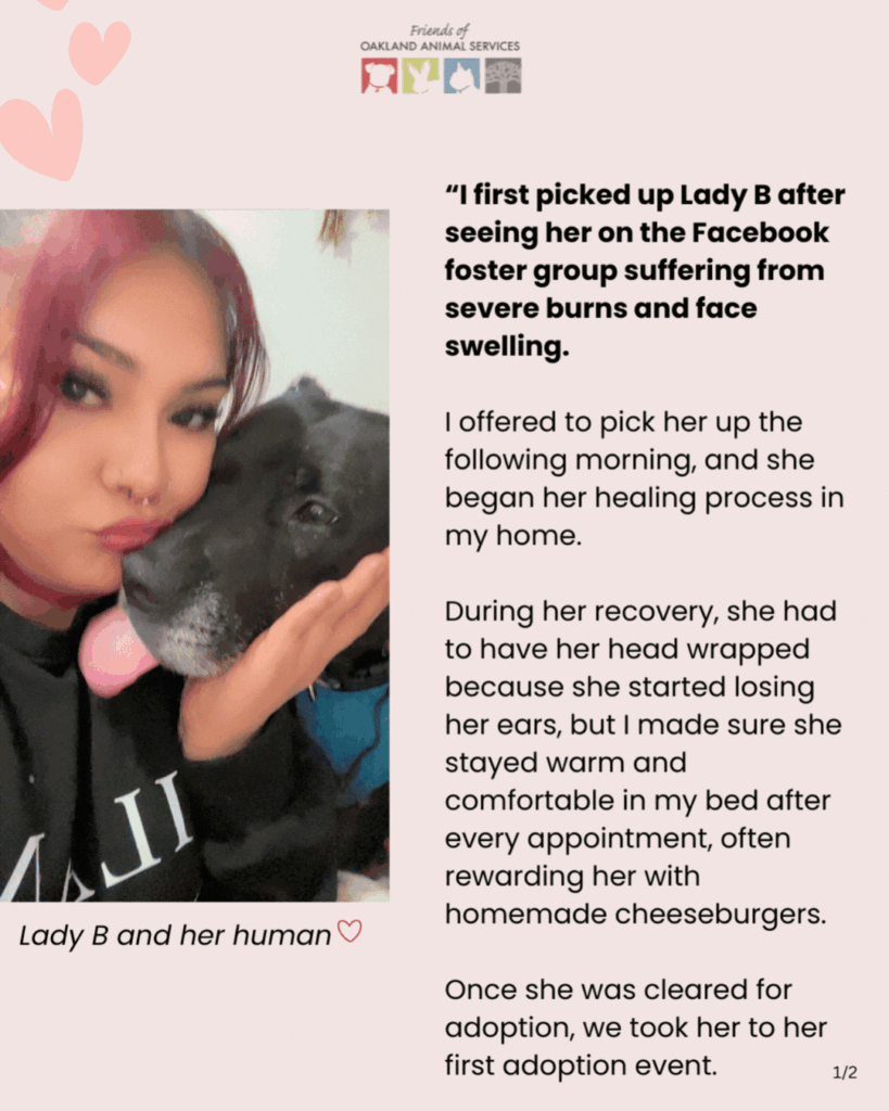 Lady B arrived at Oakland Animal Services after surviving the unimaginable, with painful burns covering much of her body in need of immediate care, patience, and time. The OAS team knew her recovery would be long. Thankfully, the foster team was ready to place her in a loving home and together with the medical team, they provided support every step of the way.